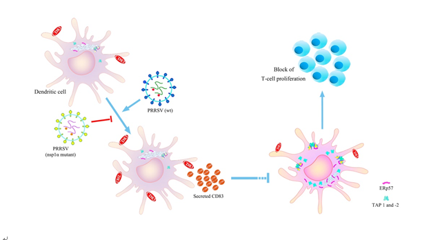 PRRSV是一种严重并持续危害全球养猪业的重要病原,致病机制尚不十分清楚。该团队在国家自然科学基金重点项目等资助下,博士研究生陈曦发现了PRRSV感染猪单核细胞衍生的树突细胞(MoDCs)通过诱导分泌CD83蛋白(sCD83),显著抑制MoDCs抗原提呈及其介导的T淋巴细胞增殖反应。首次阐明了PRRSV Nsp1α 的锌指结构域与激活CD83作用密切相关,是该病毒通过诱导MoDCs分泌sCD83抑制其免疫抑制的关键功能区域,进一步丰富了PRRSV免疫抑制的理论基础,对该病新型疫苗研究具有重要指导意义。